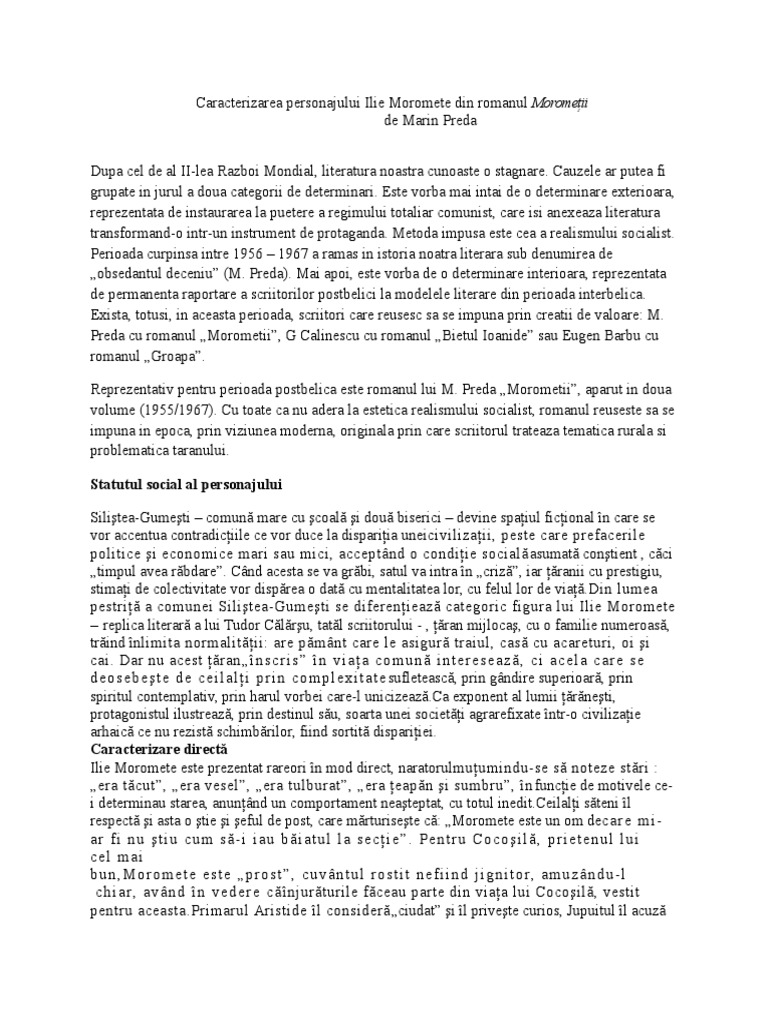 Doc Caracterizare Ilie Moromete Morometii De Marin Preda Elena Grigorescu Academia Edu