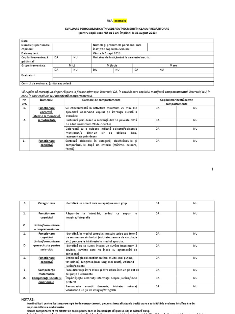 Cls Pregatitoare Exemplu Fisa Evaluare Criterii 2013 Doc