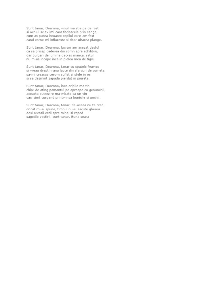 Sunt tanar doamna nichita stanescu. Mai multe momente din emisiune găsiţi pe. Sunt tânăr doamnă tânăr cu spatele frumos şi vreau drept hrană lapte din sfârcuri de cometă să mi crească ceru n suflet şi stelele în os. In cadrul liricii romanesti reprezinta un inovator al limbajului poetic asezandu se in galeria poetilor mihai eminescu si tudor arghezi. Sunt tânăr doamnă tânăr de aceea nu te cred oricât mi ai spune timpul nu şi ascute gheara deşi arcaşii ceţii spre mine îşi reped.